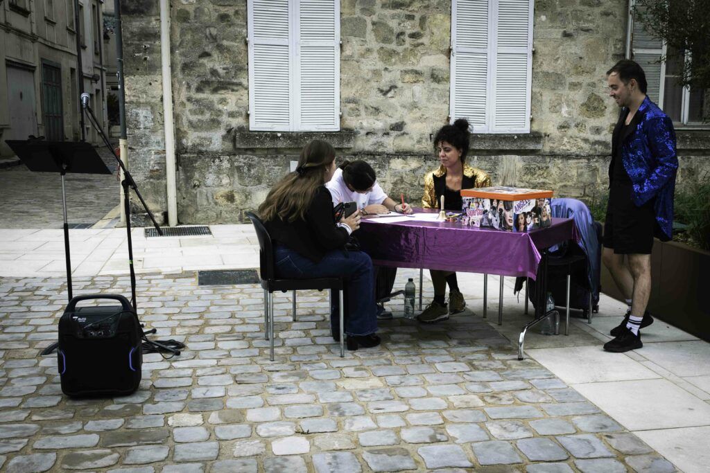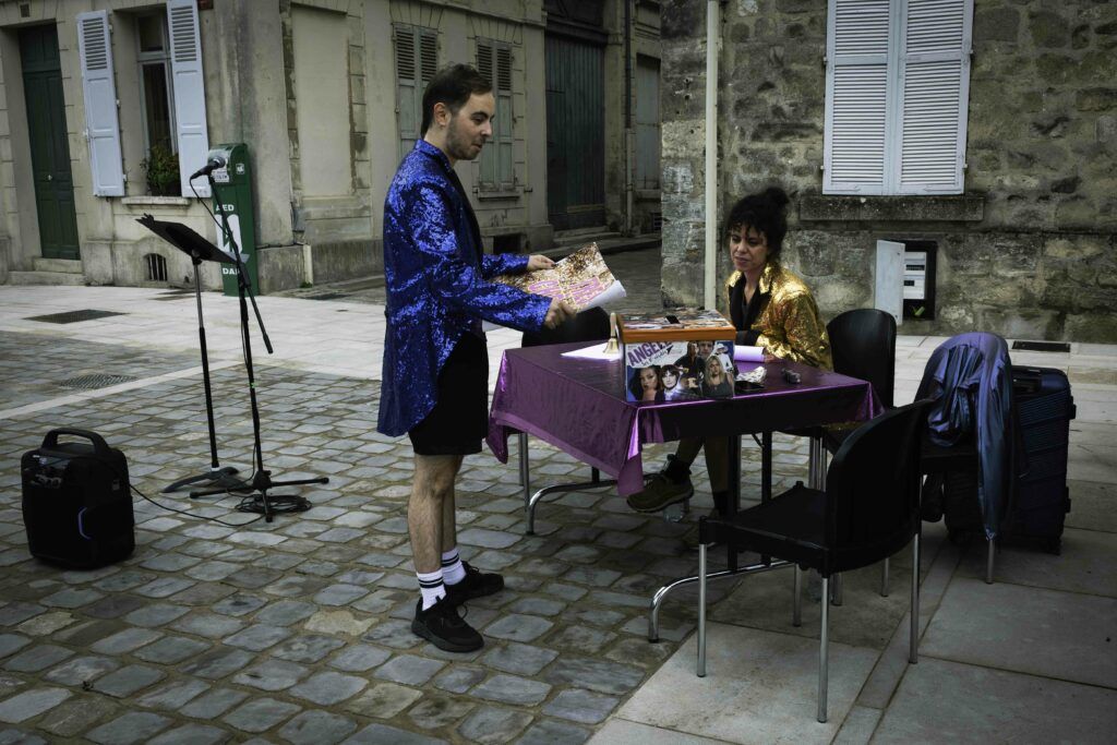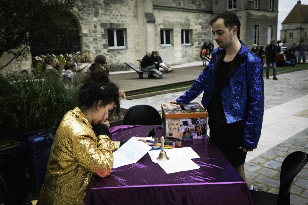D’un côté, un stand bariolé de paillettes et de magazines, comme arraché aux rêves adolescents. De l’autre, un comédien et une comédienne qui lisent à haute voix les lettres récoltées tout l’été auprès des habitant·es de l’Aisne, ainsi que celles écrites sur place le jour même. Entre ces deux pôles, le public, tour à tour spectateur et acteur, invité à écrire à son tour à l’idole de son choix.