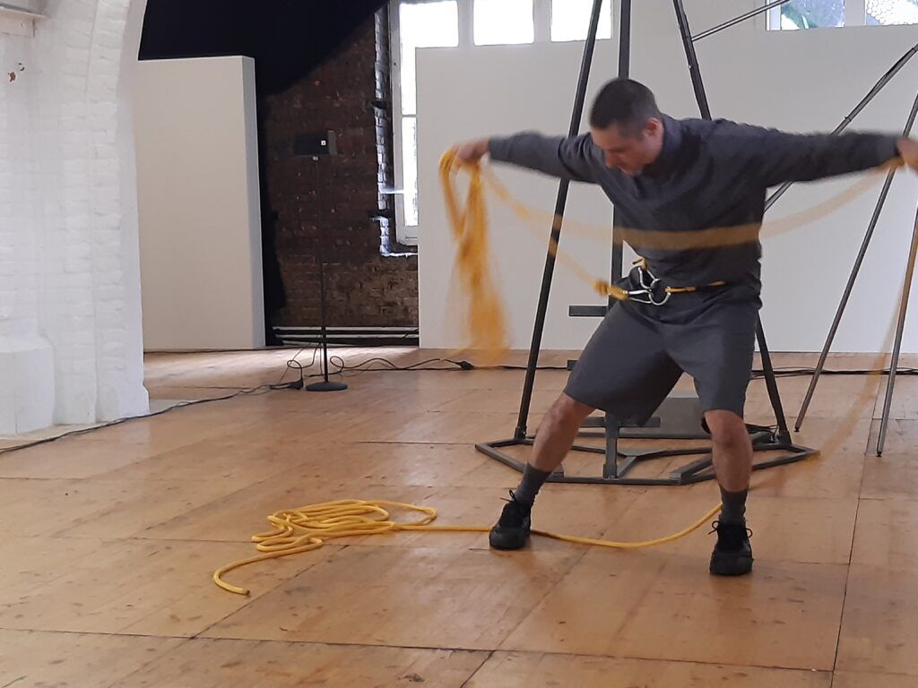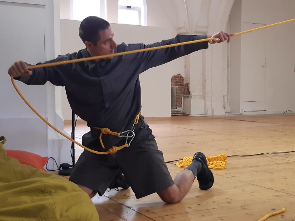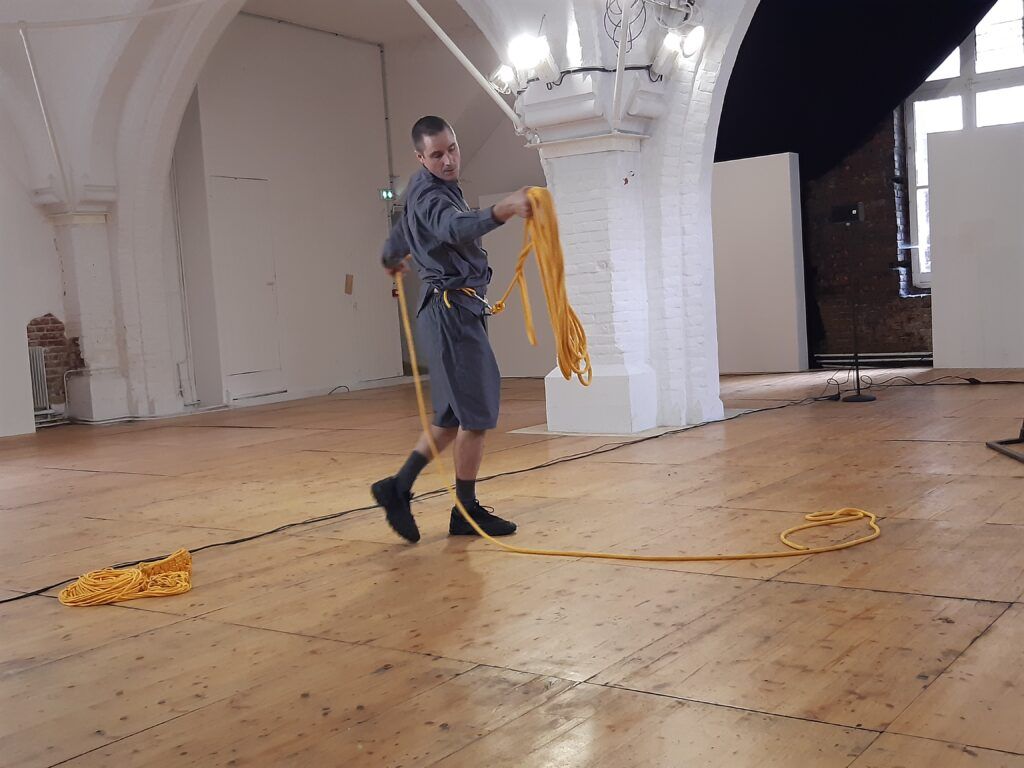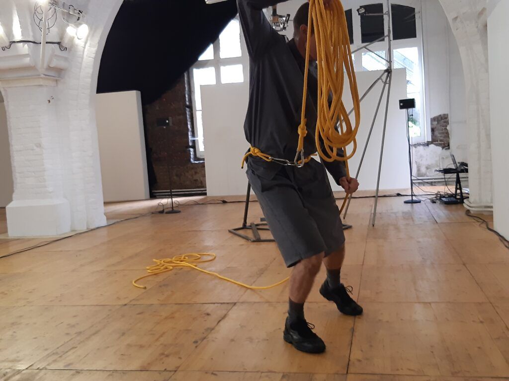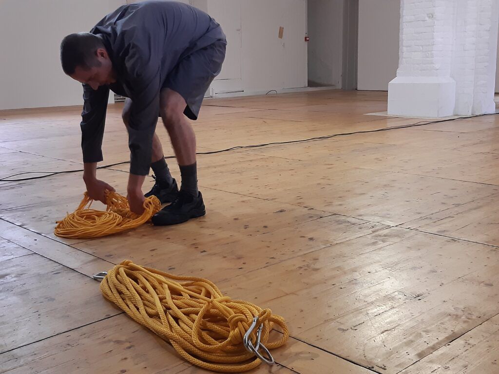Le bout de corde finit par sortir de la machine. Mathieu Calmelet se lance alors dans un ballet tournoyant pour ranger cette corde. Ses mouvements sont fluides, précis. Puis il se détache et pose la corde enroulée sur un bord de l’espace.
