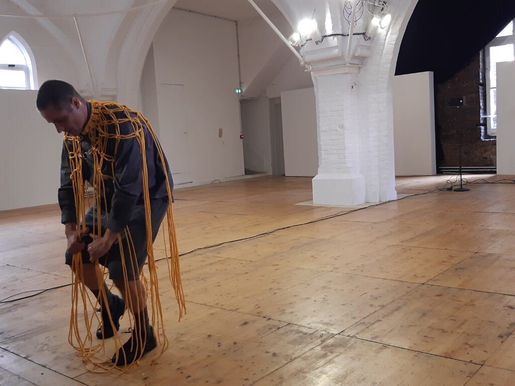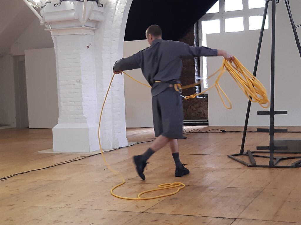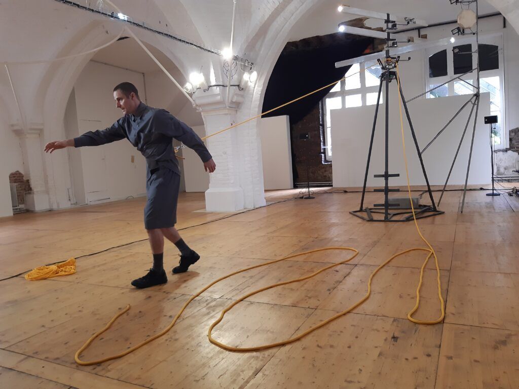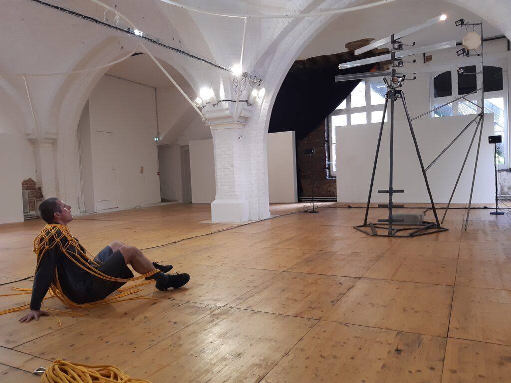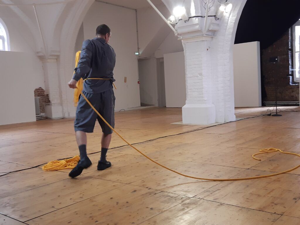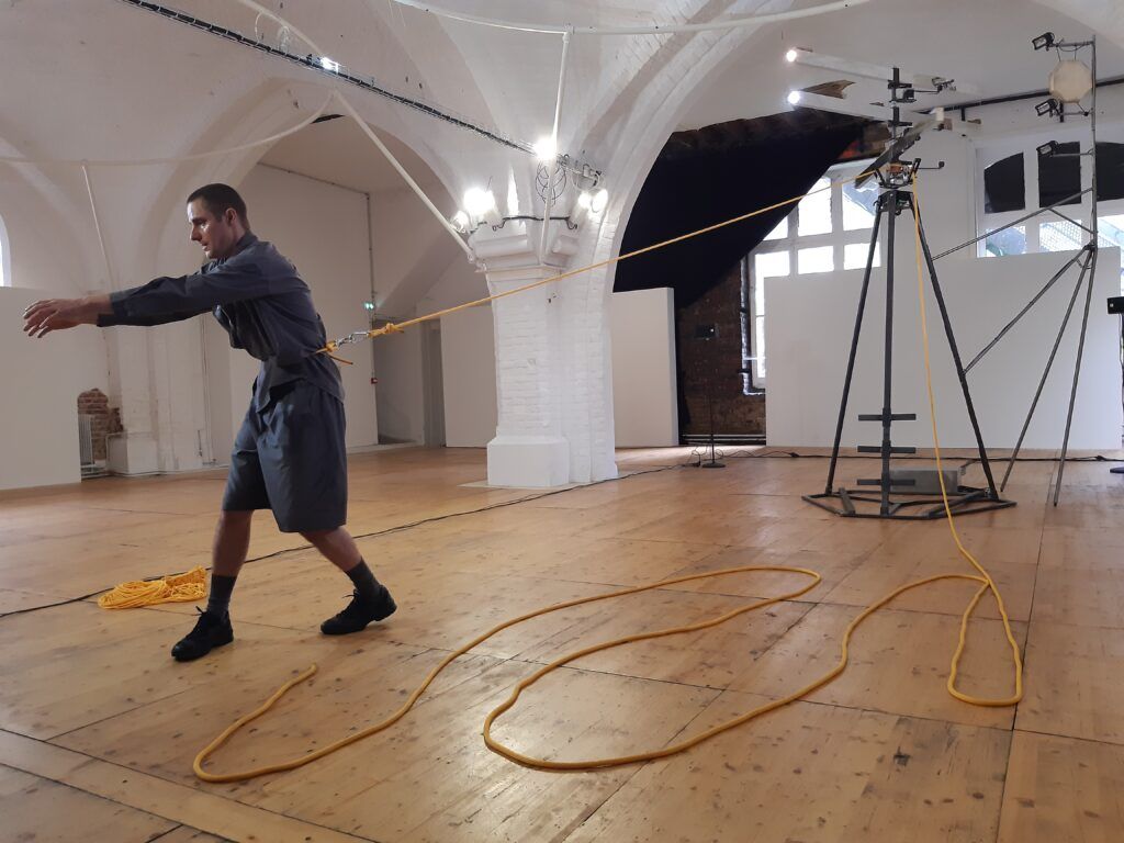 Le bout de corde finit par sortir de la machine. Mathieu Calmelet se lance alors dans un ballet tournoyant pour ranger cette corde. Ses mouvements sont fluides, précis. Puis il se détache et pose la corde enroulée sur un bord de l’espace.