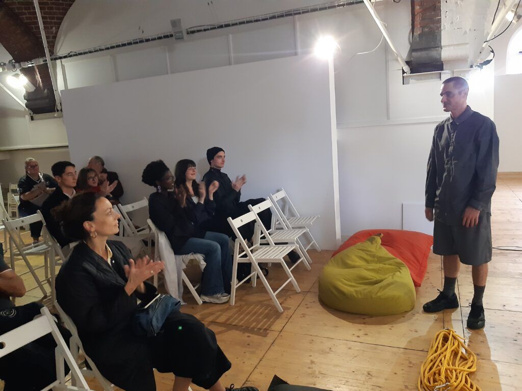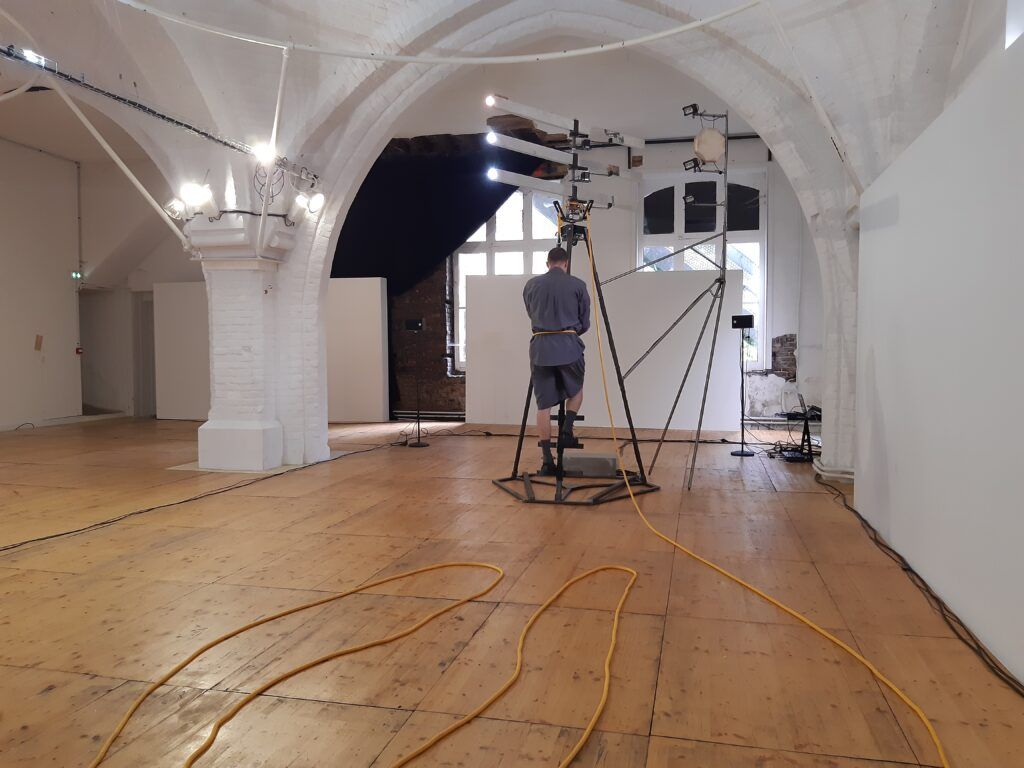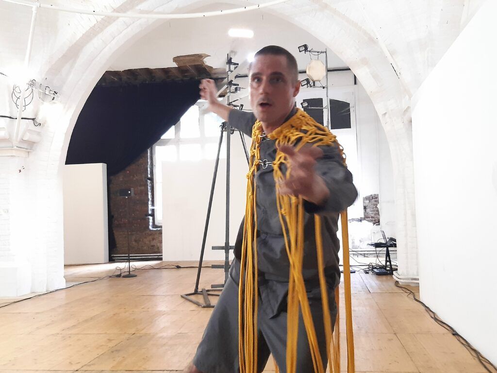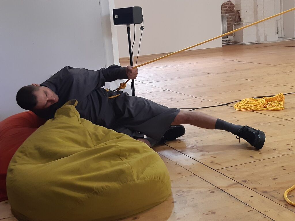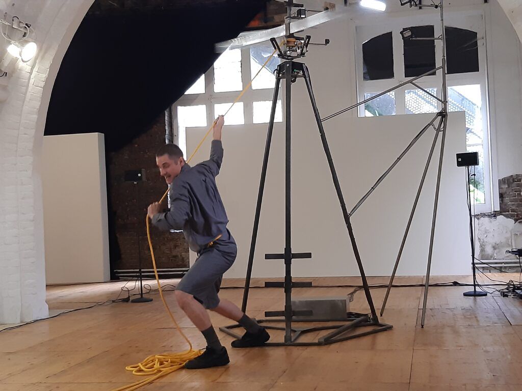 Le bout de corde finit par sortir de la machine. Mathieu Calmelet se lance alors dans un ballet tournoyant pour ranger cette corde. Ses mouvements sont fluides, précis. Puis il se détache et pose la corde enroulée sur un bord de l’espace.