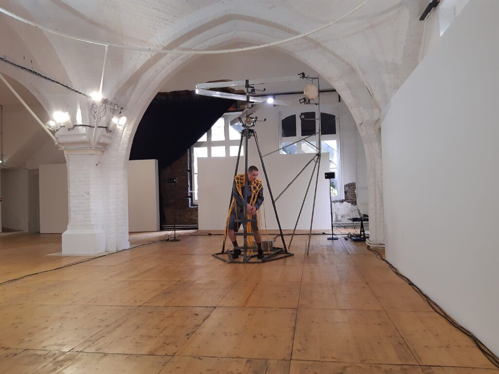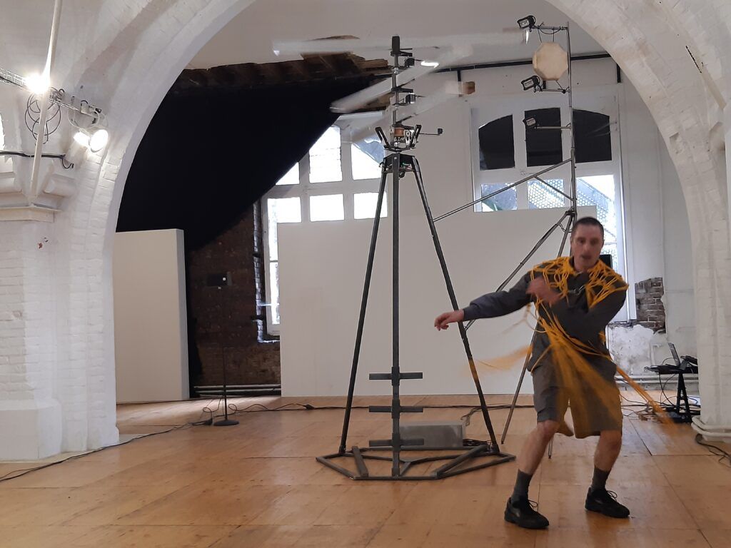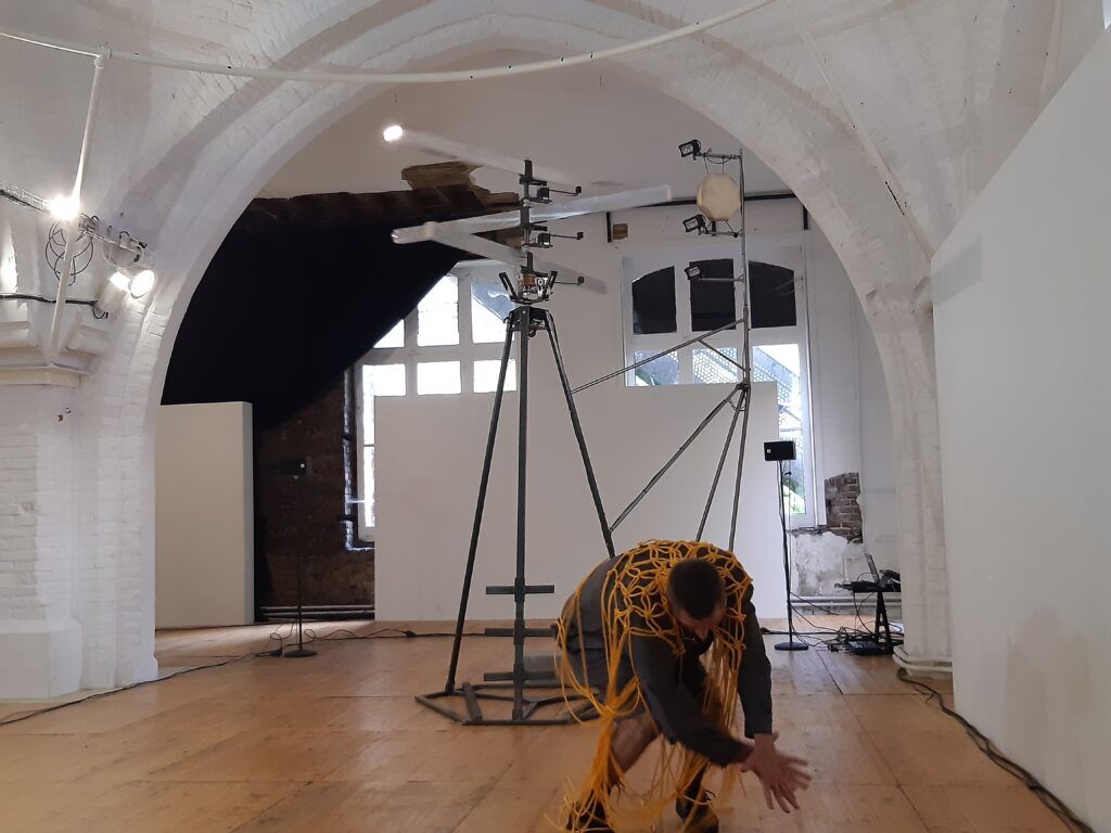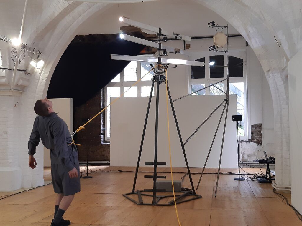Hélice sensible est une pièce chorégraphique saisissante. Il faut se laisser envahir par cette proposition. Une imposante et énigmatique sculpture trône au milieu de l’espace de la salle voûtée de L’Espace Croisé. Une longue corde jaune est posée au sol. Le danseur Mathieu Calmelet s’attache à la taille avec un bout de la corde et vient insérer l’autre bout dans la machine. Quand il redescend de la sculpture, il tend la corde. Et quand il se recule, la corde glisse lentement dans la poulie de la machine et cela la met en mouvement. Trois hélices situées à la tête de la sculpture commencent à tourner comme les pales d’un hélicoptère. Le danseur joue ensuite avec le poids de son corps pour actionner plus ou moins vite cette machine de métal et de lumières. A chaque tour d’une hélice, un son de cloche électronique, mat et doux, retentit.