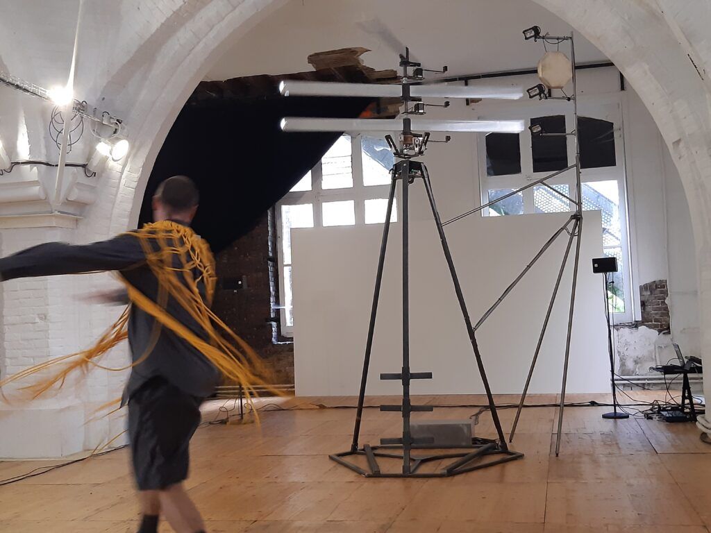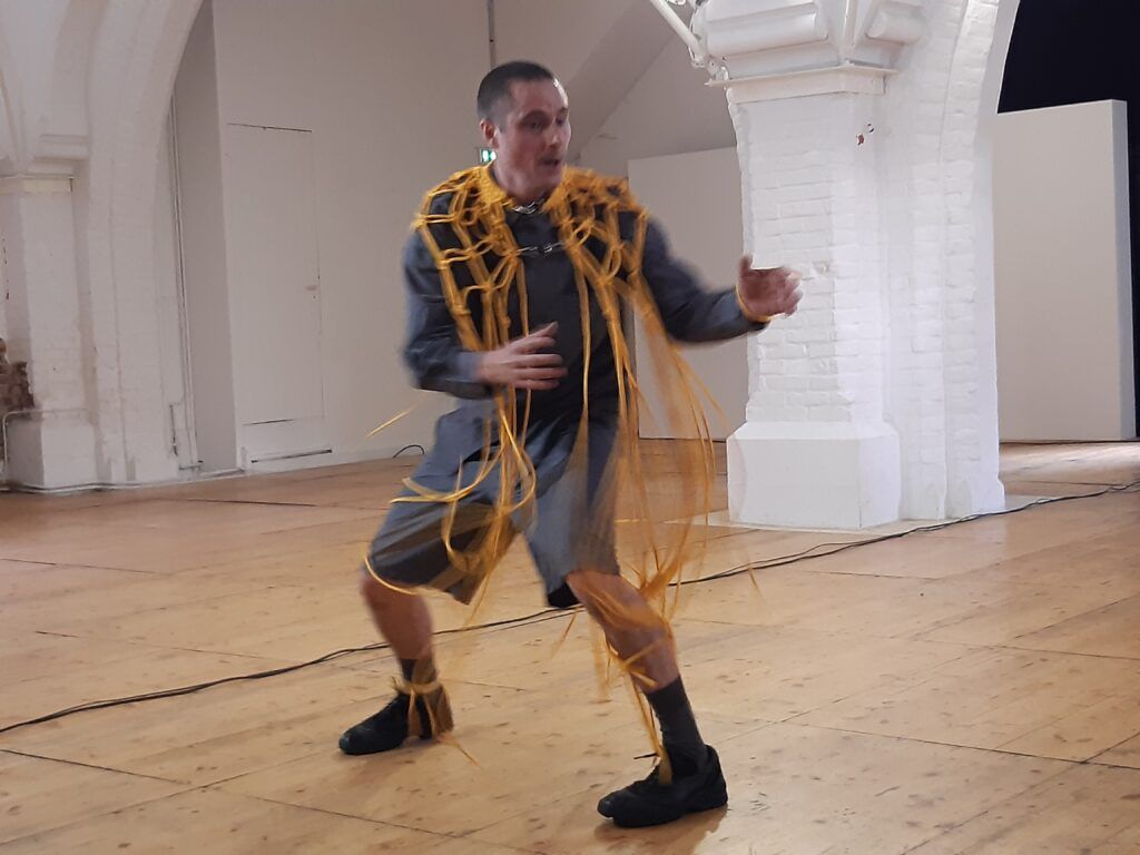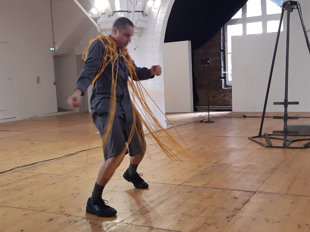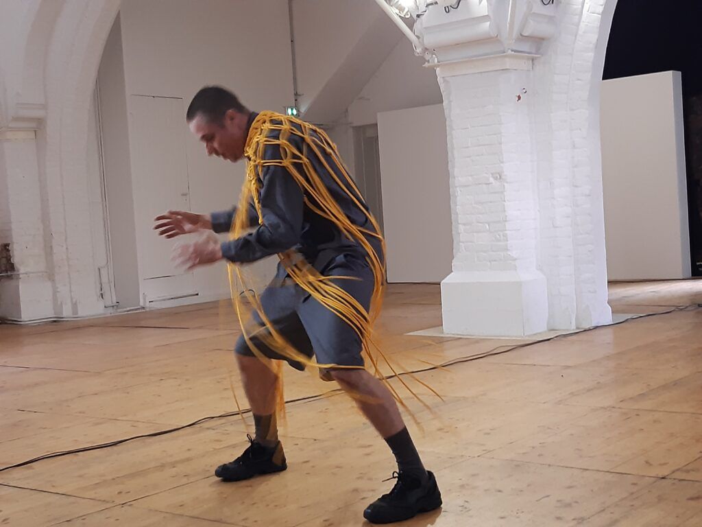 Mathieu Calmelet enfile ensuite une sorte de costume : un haut avec des bouts de cordes comme des tentacules. Il attaque alors une danse plus frénétique, comme secoué par des vagues d’électricité, avec des mouvements de corps ou de tête d’une grande animalité. Dans le même registre drone ambient, la musique est prenante, presque angoissante, toujours intense. L’impeccable diffusion de la musique, avec quatre petites enceintes sur des pieds et un caisson de basse, joue un rôle très important car la musique englobe la pièce et transporte les spectateurs dans l’univers de cette œuvre saisissante.